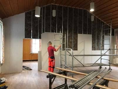In Rekordzeit von gut acht Wochen wurde das Wankhaus zum Landkindergarten umgebaut. Dafür wurde eine Trockenbauwand installiert, die den Saal in einen kleineren Ruhebereich im hinteren Teil und einen Aufenthaltsbereich im größeren vorderen Teil, trennt. Anschließend wurden der Flur- und Treppenbereich kindersicher gemacht und einige Umbauarbeiten in den Toilettenanlagen durchgeführt. Nach dem Umzug des Landkindergartens in den Neubau in der ehemaligen Schule, werden diese Einbauten selbstverständlich wieder rückgebaut.