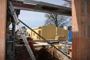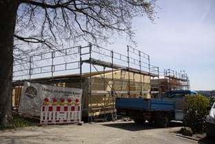 Lange war nur zu erahnen, was sich im Bereich des Eichenwegs so tut. Die Baumaßnahmen im Bestand hielten für den Bauleiter und die beteiligten Firmen einige zeit- und arbeitsintensive Überraschungen bereit. Doch nun geht es mit großen Schritten voran. Im Bereich des Altbaus wurde fleißig gemauert und aufgrund der durchwachsenen Witterungsverhältnisse ein Behelfsdach angebracht. Auch der Neubau, der in Holzständerweise errichtet wurde, ist schon fast komplett.